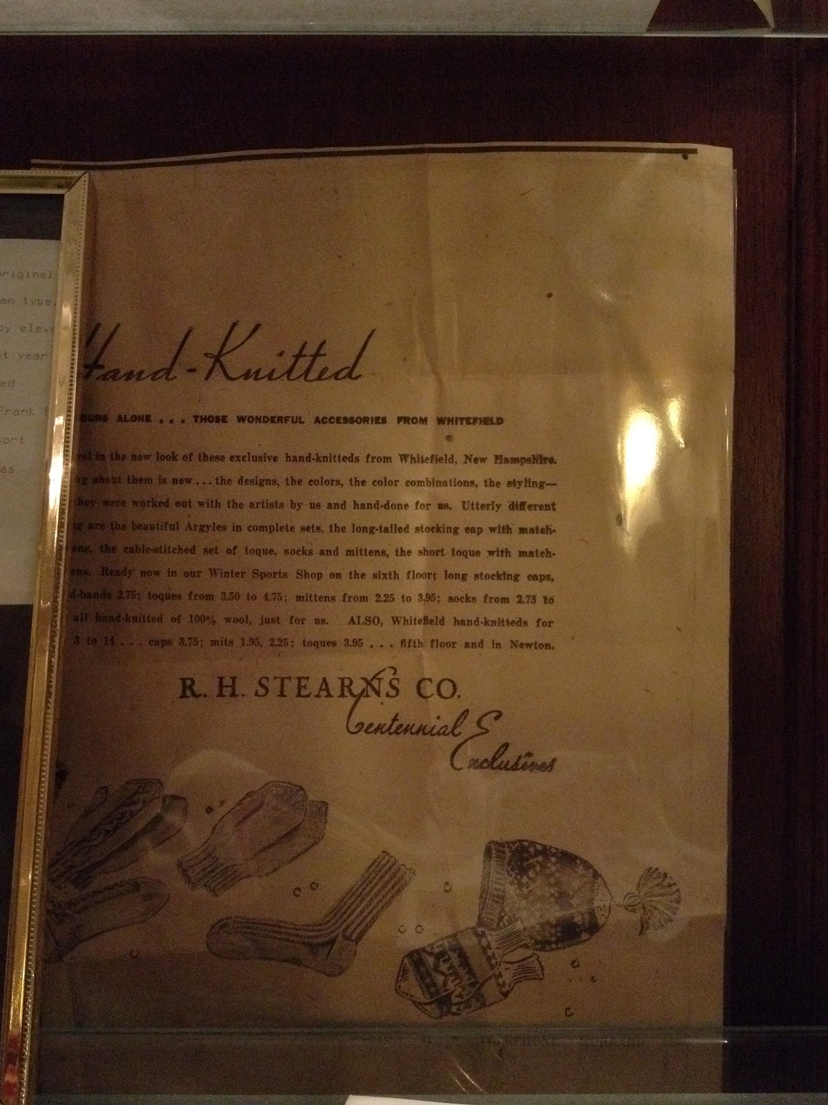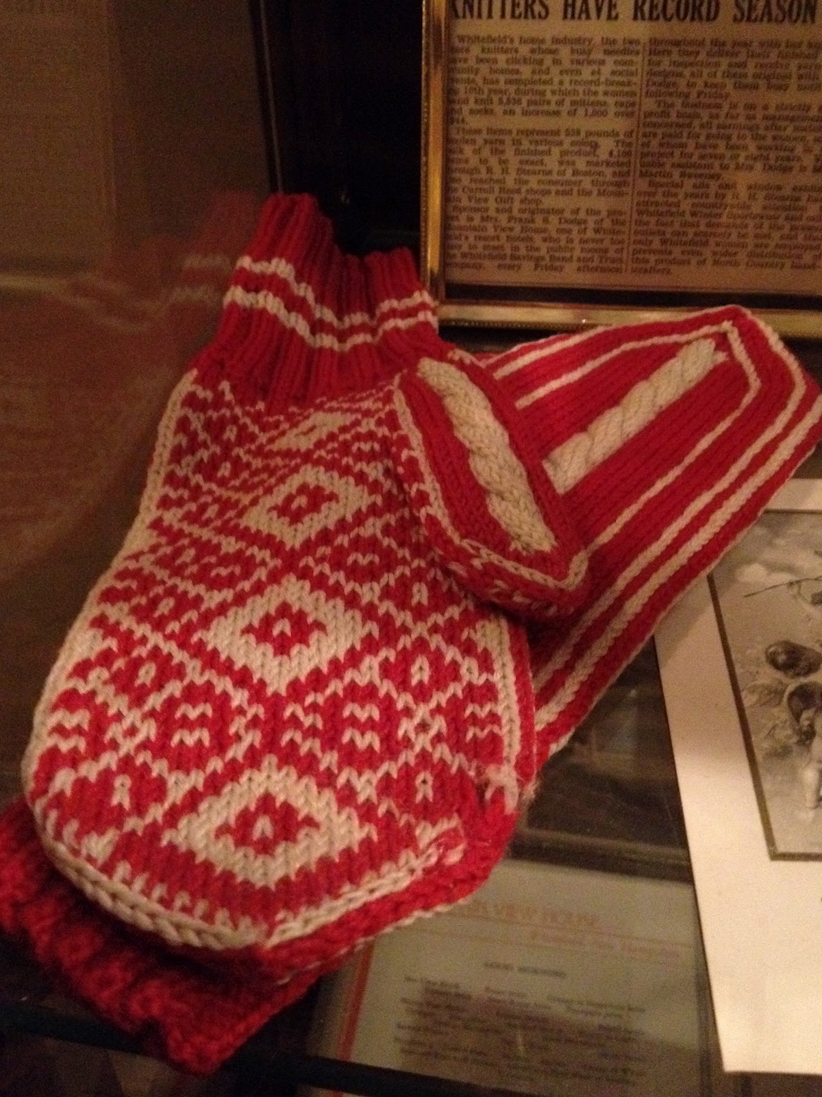 And now for the knitting section of this post…it turns out the Mountain View Grand has a knitting history. Apparently a group of women from Whitefield, NH lead by one of the owners of the MVG used to knit mittens and other winter accessories that were sold in the gift shop and through R.H. Stearns Co., a former Boston department store. What’s even better is the skier pattern featured on some of their mittens. Really wish I could get my hands on this pattern. But for now, here are a few pictures from the display case in the MVG lobby.