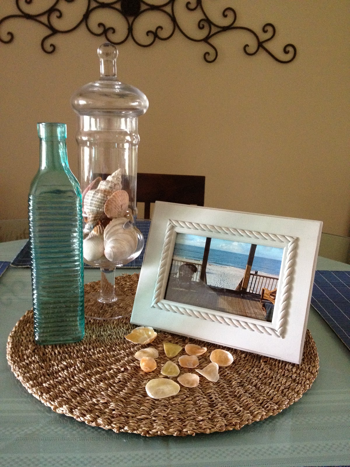 Then I proceeded to finish redecorating the table.  The spring decorations were getting a little old.  I was able to incorporate some of the shells we found & a photo from our recent trip to Dauphin Island, AL (more pictures to follow soon).  The blue wicker place-mats (69 cents a piece) and white frame ($3) were Christmas Tree Shop finds, what a deal!