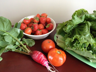 We had a wonderful fresh meal out on the deck last Friday.  I stopped and picked lettuce and strawberries on the way home from work at Dondero’s.  The radishes are from my garden.