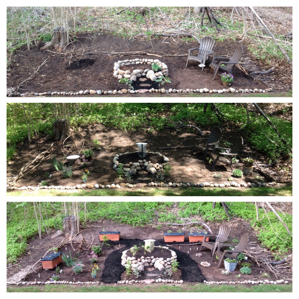 Week 1 – cleared a space at the end of the woods, made the keyhole garden foundation with rocks from the yard.
